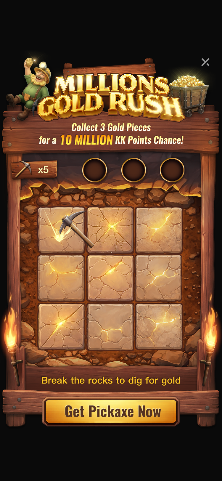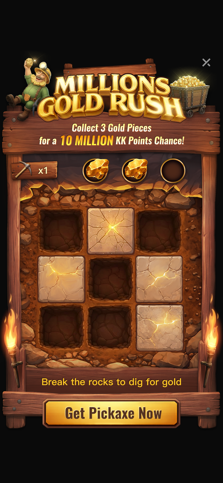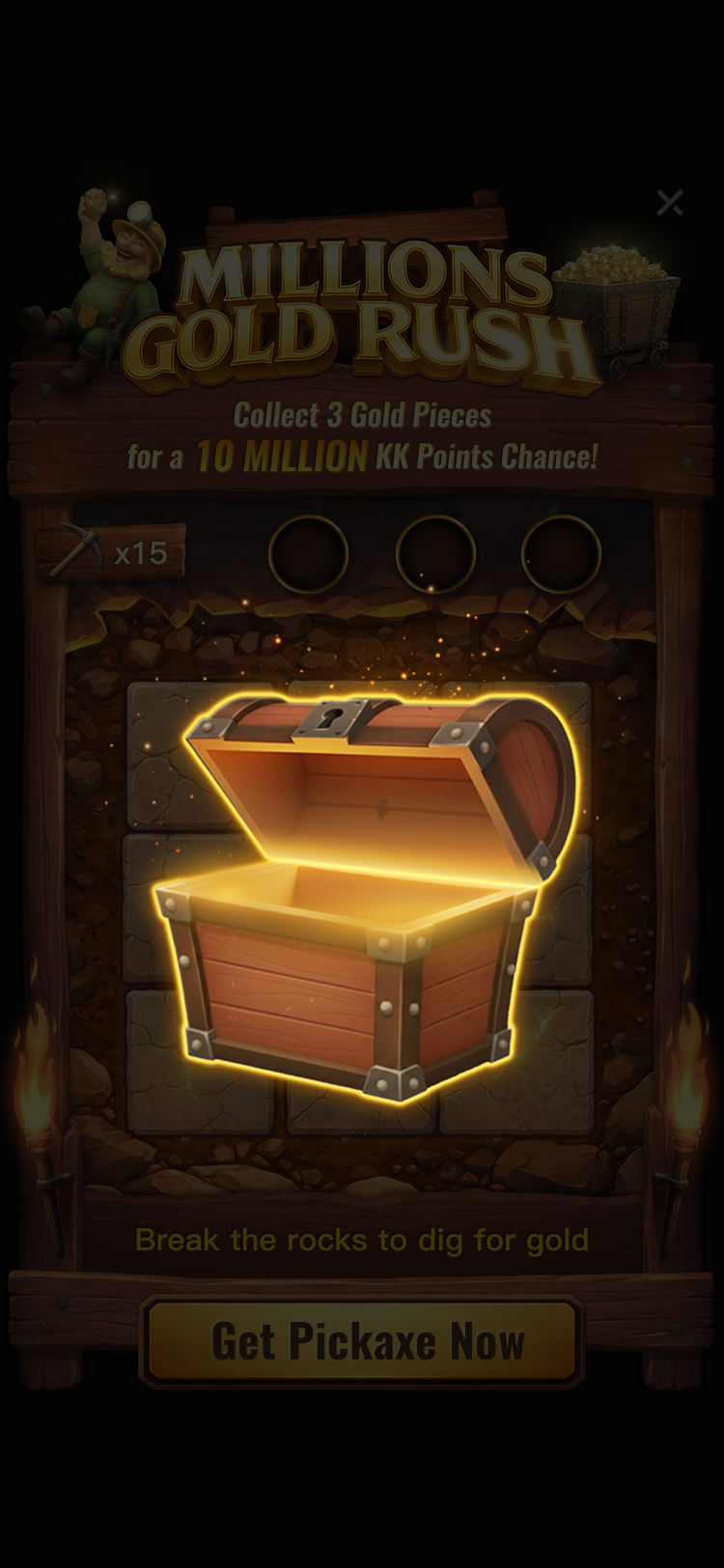 Si tienes éxito, ganarás un premio instantáneo de hasta 1M KK Points. Si logras encontrar tres piezas de Oro durante el evento, tendrás la oportunidad de ganar el premio mayor de 10M KK Points.