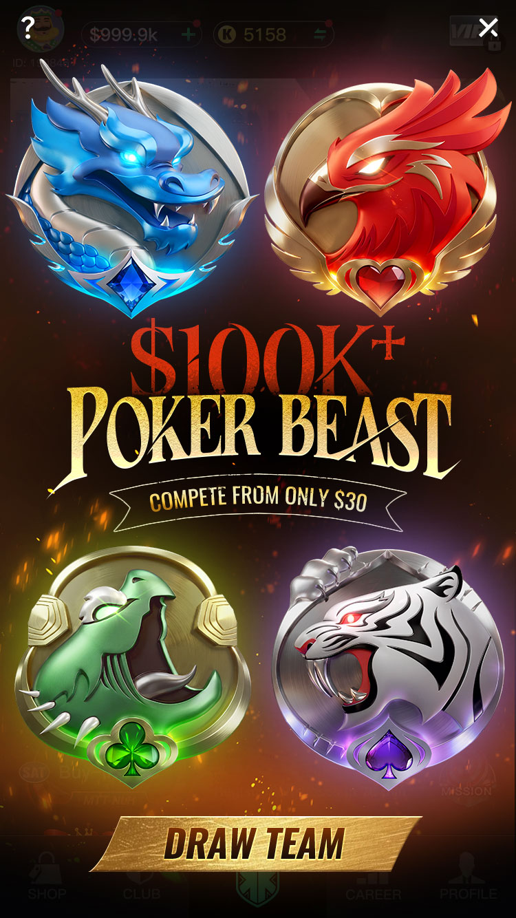 Step 1) ¡Sortea tu equipo Poker Beast desde el pop-up dentro de la app! Serás asignado a uno de estos equipos: Phoenix, Tortoise, Tiger o Dragon.